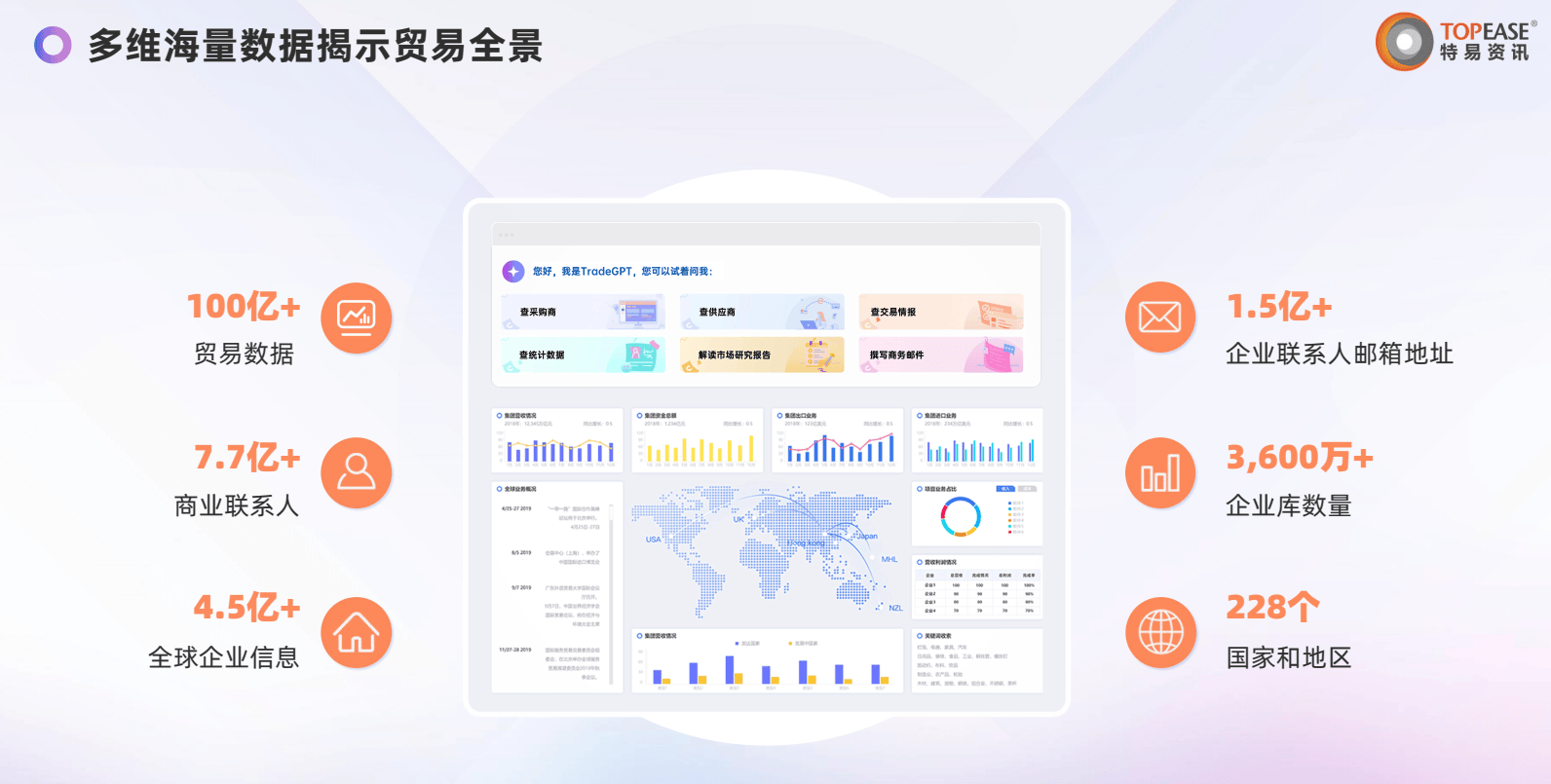 此外,AI智能保举功能还能帮力企业洞察市场趋向。通过对海出口数据以及其他相关数据的分析阐发,它可以或许为企业供给关于市场需求变化、新兴市场机遇以及合作敌手动态等方面的有价值消息。例如,按照数据显示某地域对某类特色皮具(如手工定制皮具)的进口量呈现快速增加趋向,企业便可及时调整产物策略,加大正在该地域的市场推广力度,开辟合适本地市场需求的产物,从而正在激烈的市场所作中抢占先机。AI拓词功能是外贸资讯宝的又一亮点。它可以或许无效地拓展同类词、同类产物词、相关行业词以及尺度申报名称词等。正在海出口数据查询过程中,这一功能极大地拓宽了企业的搜刮范畴和营业视野。以一家专注于家具出口的企业为例,本来企业正在查询海关数据时可能仅局限于常用的家具产物名称相关词汇。通过AI拓词功能,企业能够发觉诸如“智能家居家具”“环保家具材料”“办公家具定制”等拓展词汇。这些词汇可以或许帮帮企业正在海关数据查询中挖掘出更多潜正在的市场需乞降贸易机遇。例如,企业发觉“智能家居家具”的进口量正在某些发财国度呈现上升趋向,便可考虑将智能元素融入到保守家具产物中,开辟出具有智能功能的家具系列,从而满脚市场对智能家居产物的需求,开辟新的营业范畴,提拔企业的市场所作力。外贸资讯宝中的TradeGPT功能基于深度进修手艺,并具有多年的语料堆集。它采用问答式交互体例,极大地简化了企业取海出口数据之间的交互流程,为企业决策供给了高效便利的支撑。正在以往,往往需要正在复杂复杂的数据系统中进行繁琐的筛选、阐发和比对工做。而现正在,借帮TradeGPT,企业只需间接输入相关问题,即可敏捷获得较为全面的谜底。例如,企业想要领会某类电子产物正在亚洲市场的进出口政策变化以及对本身营业的影响,只需正在TradeGPT中提问,就能获得细致的政策解读、可能面对的风险评估以及应对策略。这使得企业可以或许及时、精确地控制市场和政策消息,快速做出决策,调整营业策略,无效降低运营风险,确保外贸营业的稳健运转。